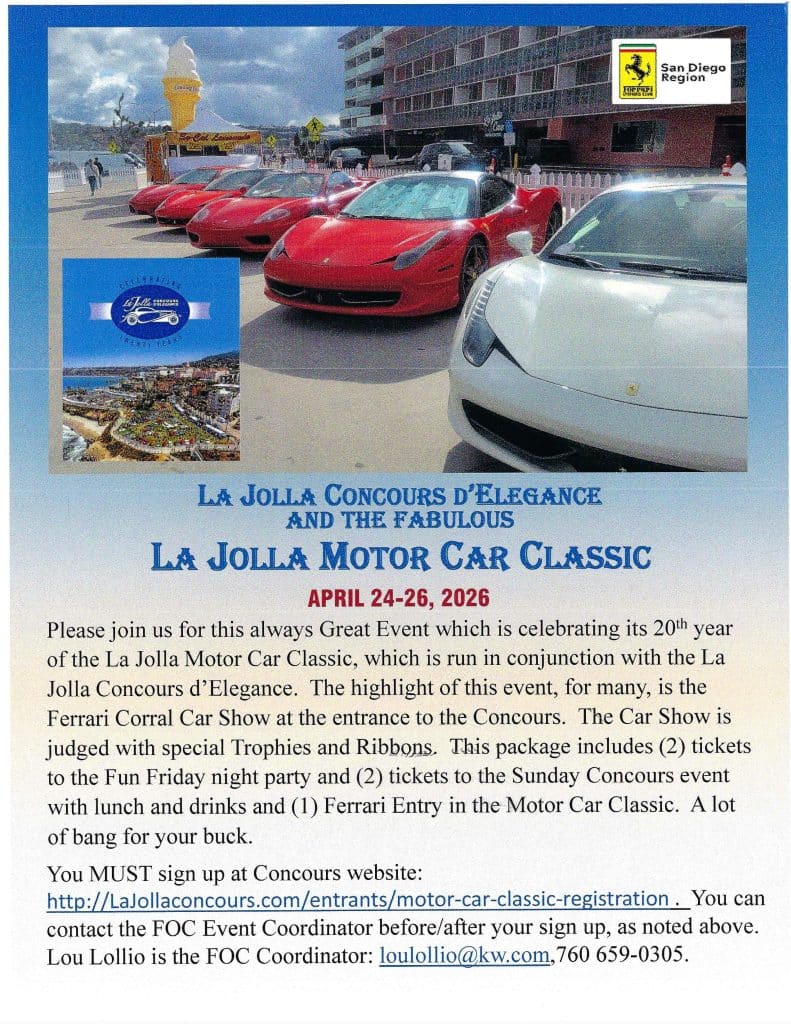 It’s La Jolla Concours season! Tickets for this event are not sold through the FOC, but rather the La Jolla Concours website. We recommend registering your Ferrari in the La Jolla Motorcar Classic. This will include two tickets to the Friday evening VIP Opening Soirée in addition to two tickets to the Sunday Concours and the entrant lounge which includes lunch and adult beverages.